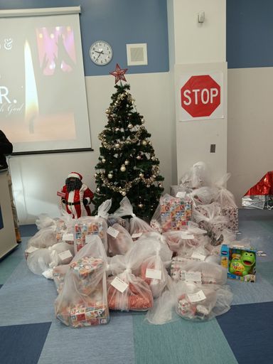 100 Christmas Gifts for childen, 5 Food Gift Cards, and breakfast for everyone